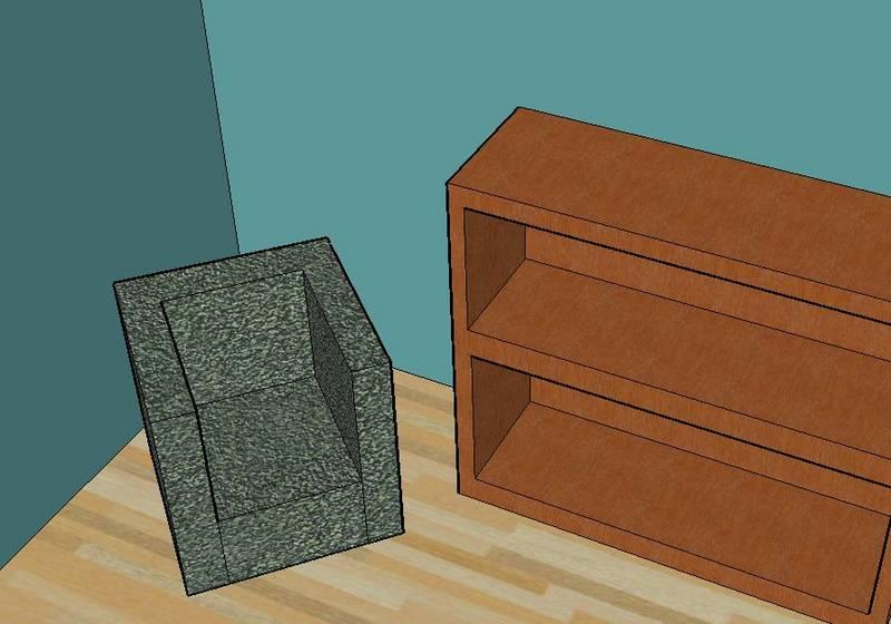 16-vamos a crear ahora los muebles. Aquí haremos los más fáciles y simples, los más complejos podemos descargarlos de 3d warehouse, como sillas rústicas y tal, no es que sean difíciles, simplemente, es un coñazo. Bien, he aquí un estante (creo, no se sabe muy bien que es cada cosa). Pues creamos su forma, usando la herramienta rectángulo, tal que así: