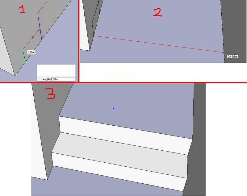 Yo di a los escalones una altura de 30 cm. (aunque en el dibujo se vea 1 metro y 30, es que la casa estaba mal escalada cuando las hice) y con todos estos datos, empezamos. Comenzamos a construirlas dónde dicen los planos, y dibujamos en la pared su forma como veis, he pintado las líneas, la cyan indica dónde empieza la escalera, pues tiramos hacia arriba escribiendo la medida, dependiendo de las unidades que uses y pulsando enter, como ya dije (1), la roja, es la longitud del escalón, dado por los planos, y la morada es la altura total, obviamente sumando la altura del primer escalón tantas veces como escalones haya.