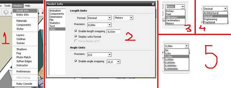 Bien, para cambiar las unidades, ve a window->model info->units, (1), (2), en la figura 3 puedes elegir un tipo de unidades dentro de un sistema, en la 4, un sistema, y en 5, la cantidad de decimales que quieras, yo creo que con 2 decimales basta.