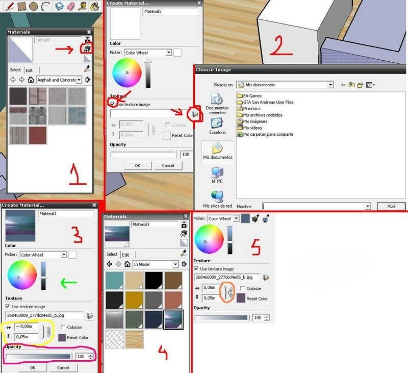 Primero, dale al botón de textura, te saldrá el menú de texturas (1), dale al botón marcado con la flecha. Luego, dale a la casilla marcada con la flecha en la figura (2), y luego, dale al botón que sale también marcado en rojo, entonces, busca la imagen o textura que deseas usar, y dale a abrir. Una vez le des, veras el menú de crear material con tu textura ya puesta. (3) puedes ajustar el color y/o tonalidad en la sección con la flecha verde. En la vista previa puedes ver cómo quedaría. También puedes poner nombre a la textura, dónde dice material1, luego, en la zona redondeada en amarillo, ajustas el tamaño de la textura. Si es muy pequeño, se verá microscópica, y si es muy grande, se verá enorme, ajústala como veas. En la zona en rojo, ajustas la opacidad (transparencia) de la textura. En la figura (4), puedes ver tu textura lista para usar, en la sección in model, y por último, en la figura (5), si le das al botón en naranja, desactivaras la compensación de tamaño, ya que, cuando esta activado, si cambias la anchura, se ajusta equitativamente la longitud para mantener las proporciones, pero si esto te impide ajustar bien la textura en el modelo, desactivándolo podrás poner longitud y anchura a tu gusto.