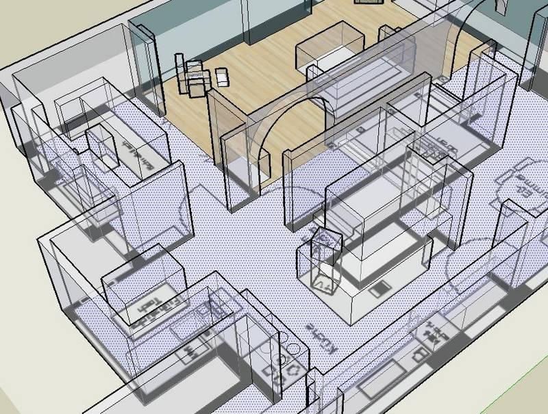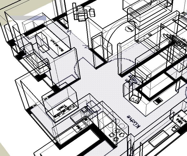 En modo X-ray (rayos x) conseguimos lo que deseamos, ver el modelo semitransparente para ver los planos tapados por paredes y suelo, y de paso ver si hicimos algo mal.