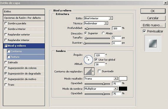 (7) después le aplicas un estilo de capa, ir al menú (capa) + (estilo de capa)+(bisel y relieve) en (profundidad le escribe 100%)+(tamaño 5)+(suavizar 0) le aplicas un o.k.
