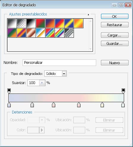 2.- En la misma capa de texto nos vamos a capas y le aplicamos un estilo de capa (superposición de degradado) con la siguiente mezcla la de colores :