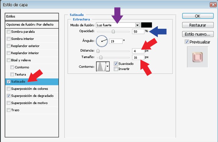 3.- Nos vamos a capas y le aplicamos otro estilo de capa (satinado) y le escribimos los siguientes valores: (modo de fusión)+(luz fuerte)+(opacidad 50%)+(ángulo 19º)+(distancia.