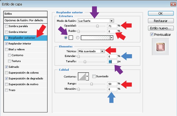 5.- Ahora le aplicamos otro estilo de capa (resplandor exterior) y le escribimos los siguientes valores: (modo de fusión luz fuerte)+(opacidad 71%)+(ruido 0%)+(cambiamos el color a blanco)+(técnica más suavizado)+(extender 0%)+(tamaño 49 px.)+(rango 50%)+(vibracción 0%).