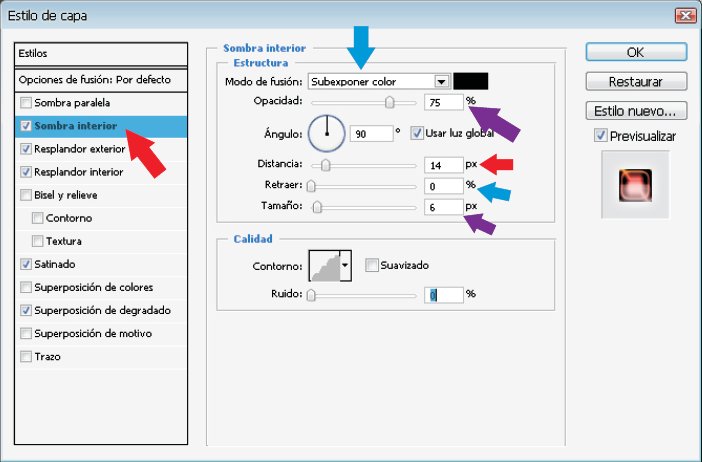 6.- Volvemos a aplicar otro estilo de capa (sombra interior) y escribimos los siguientes valores: