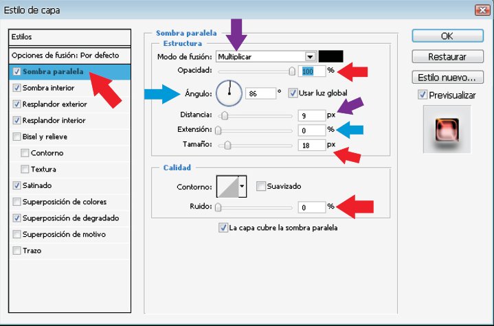 7.- Aplicamos otro estilo de capa (sombra paralela) y le escribimos los siguientes valores: (modo de fusión multiplicar)+(opacidad 100%)+(ángulo 86º)+(distancia 9px)+(extensión.