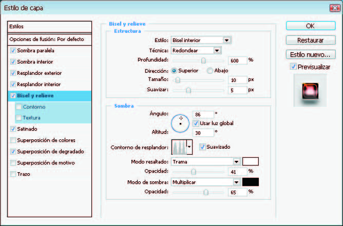 Estilo+(bisel interior)+(profundidad 600%)+(tamaño 10px) + (suavizar 5px)+(ángulo 86º)+(altitud 30º)+(suavizado)+(contorno de resplandor aro triple)+(opacidad 41%)+(opacidad 65%).