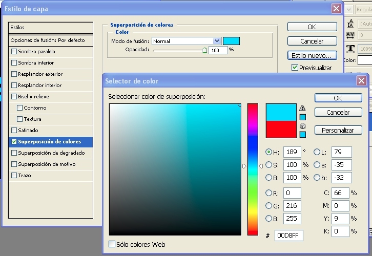 3.- Nos vamos estilo de capas y en los estilos de capa seleccionamos (superposición de colores) y elegimos un color azul celeste, puedes escribir en la casilla del número de color: 00d8f.