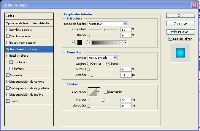 4.- Ahora en nuestra capa actual nos vamos a estilos de capa y seleccionamos (resplandor interior) y les escribimos los siguientes valores-> (modo de fusión)-> multiplicar-> (opacidad) 50%->(ruido) 0%-> (color) negro (borde)->(retraer) 0%-> (tamaño) 13 píxeles.