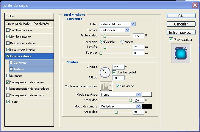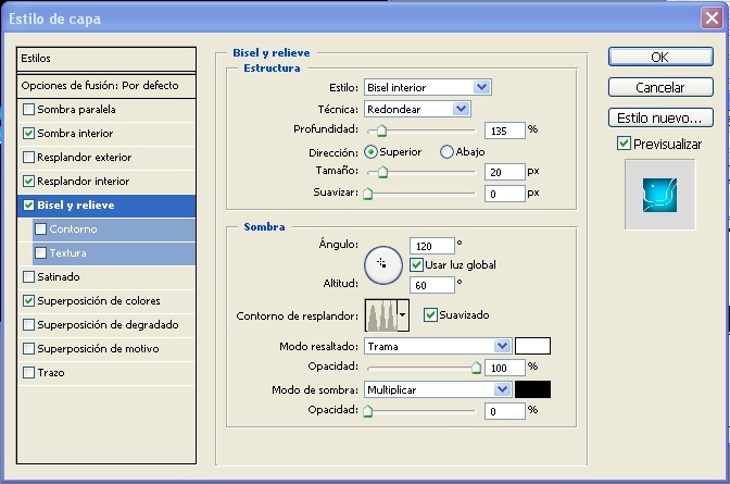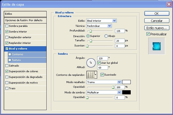 7.- Ahora le escribimos unos valores en el estilo de capa (bisel y relieve)->(profundidad) 135%- >(tamaño) 20 píxeles.-> (suavizar) 0%->en el apartado de sombra escribir (ángulo) 120 - >(altitud) 60 ->(suavizado)->(opacidad) 100% y en (modo de sombra)-> (multiplicar)- >(opacidad) 0%.