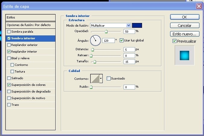 5.- Ahora le añadimos otro estilo de capa-> (sombra interior) y le escribimos los siguientes valores->(multiplicar) y le cambiamos el color a un azul oscuro escribe el número de color-> 310899 y en (opacidad) le escribimos 50%, y en (tamaño) les escribimos 15 píxeles.