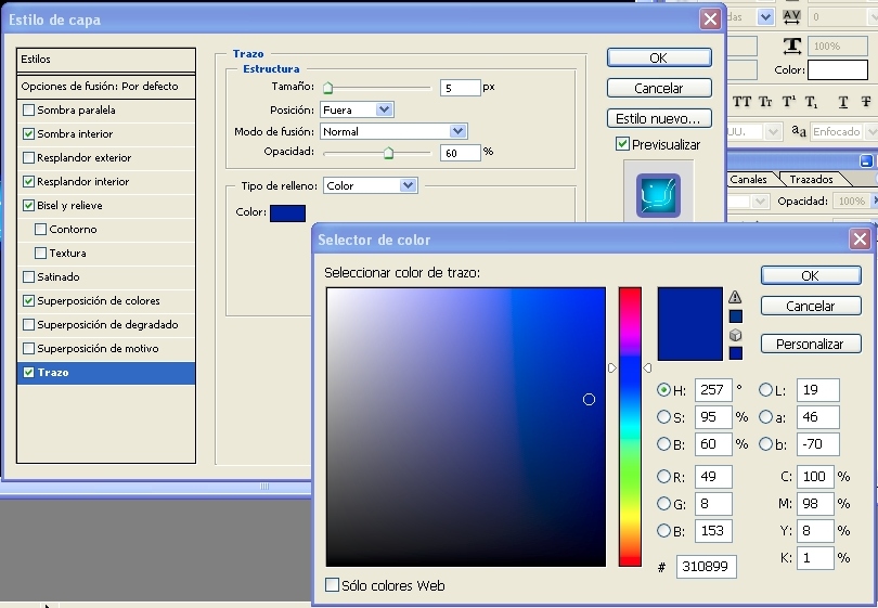 8.- Ahora añadimos otro estilo de (capa)->(trazo)->(color)->cambiamos el color por uno más oscuro en este caso escribimos el número de color->310899 y les escribimos unos valores en-> (opacidad) 60% y le escribimos unos valores en (tamaño) 5 píxeles.
