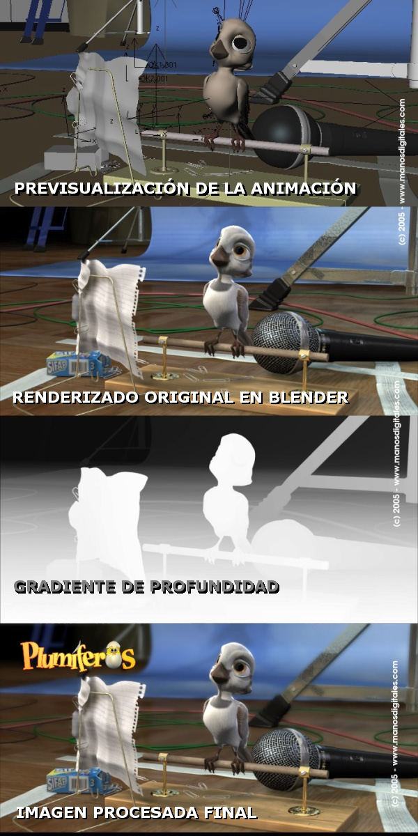 En este artículo quisiera resumir brevemente la realización del avance (trailer) del proyecto Plumíferos, un proyecto comercial de largometraje de animación 3d que estamos realizando en Argentina utilizando Blender. Este avance fue estrenado durante las conferencias de Blender en Siggraph 2005, y luego fue nominado para el premio Suzanne (Suzanne award) edición 2005, en el Blender art festival. Si no has podido verlo, visita http://www.plumiferos.com.