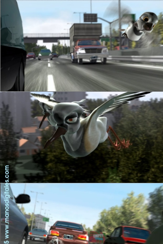 Los personajes y modelos originales de Daniel fueron modificados, modelados y texturizados al mismo tiempo que se creaban las escenas para recrear ciertas partes de la ciudad de Buenos Aires donde ocurre la acción. Había muchas cuestiones que, abordar. Teníamos personajes con plumas en sus alas, árboles en cantidad, muchos automóviles alrededor, y alas desenfocadas con Motion Blur y las propias limitaciones y salvedades de Blender. Hay que tener en cuenta que usamos Blender 2.36, así que, no teníamos las herramientas de animación de personajes que están disponibles actualmente.