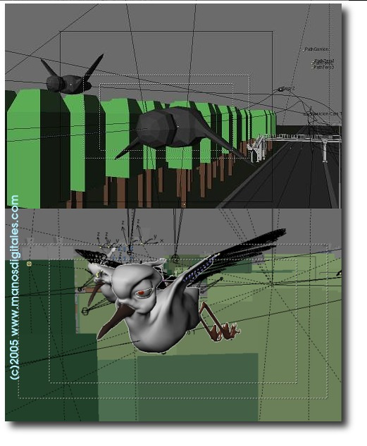 Una vez que se hizo y corrigió la animación de objetos y cámaras, las marionetas fueron remplazadas por los personajes finales. Este procedimiento hizo que el trabajo con escenas largas fuese mucho menos penoso. Realmente, los personajes principales se agregaron en escenas separadas mientras que todos los fondos quedaron en un lugar separado. Al trabajar de esta manera, pudimos enfocarnos en la coreografía del vuelo y las gesticulaciones sin tener que preocuparnos por las transformaciones en tiempo real de la geometría de los fondos. Además, al mismo tiempo que estábamos animando, los personajes estaban siendo modelados y texturizados por separado.