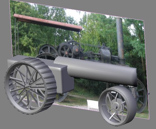 Fui afortunado al haber tomado una fotografía de la vista lateral de la máquina, ya que esto facilito el modelado. Aquí hay una versión primaria del archivo blend, durante la fase inicial de modelado: vea la imagen de la derecha. Hay un plano en el medio, con la fotografía que tomé insertada en el con UV mapping, de modo que se visualice en la vista 3d. Este plano está escalado hacia los valores correctos de altura y ancho de la máquina. Un paso muy importante antes de comenzar el modelado, es determinar la escala. Blender utiliza unidades internas, no unidades reales, así que, para poder realizar una escena realista, tú debes decidir qué significa una unidad Blender (bu). En este caso, opté por 1 bu = 10 centímetros, la máquina completa mide 4 metros de largo por 2,4 de altura.
