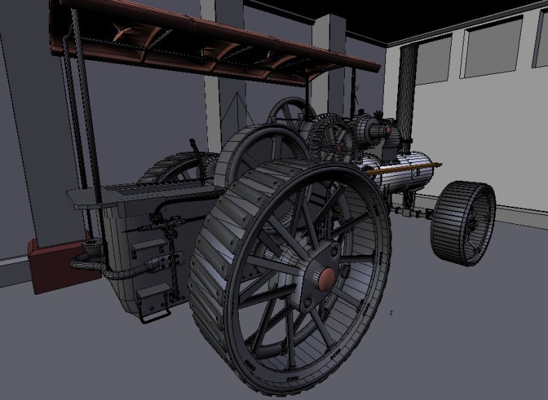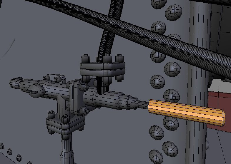 Detalles. Muy importante agregar el tok final de realismo de toda escena: añadir los pequeños detalles, estos son los que aportan realismo a la escena. Aquí hay una vista en primer plano del modelo, con el mallado alámbrico visible. Note las tuercas y pernos, todas las conexiones están modeladas. Sin embargo, algunos modelados, como las piezas en la parte trasera del motor, no resultan visibles en el render final.