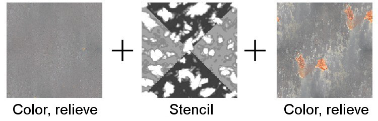 Durante el modelado, siempre comienzo agregando materiales y texturas. La mayoría de las partes metálicas, utilizan metal, un metal oxidado. Esto se hizo con una sencilla técnica, que utilizo para ocultar texturas repetidas. La forma en que opera es la siguiente: hay dos texturas metálicas similares: la primera es un metal simple, la segunda un metal oxidado, ambas similares en color.