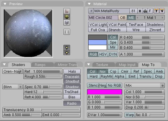 Éstas dos texturas provienen de unas fotografías muy cercanas que tomé. Ambas están separadas por otra textura, una textura clouds con colour-band activo. La colour-band es mitad blanca y opaca, la otra mitad es blanca y transparente. Entonces se coloca entre las otras dos texturas y se pulsa el botón stencil en material settings, panel map todo. Esto hace que algunas partes de la textura oxidada se vean a través, y algunas no, al azar.