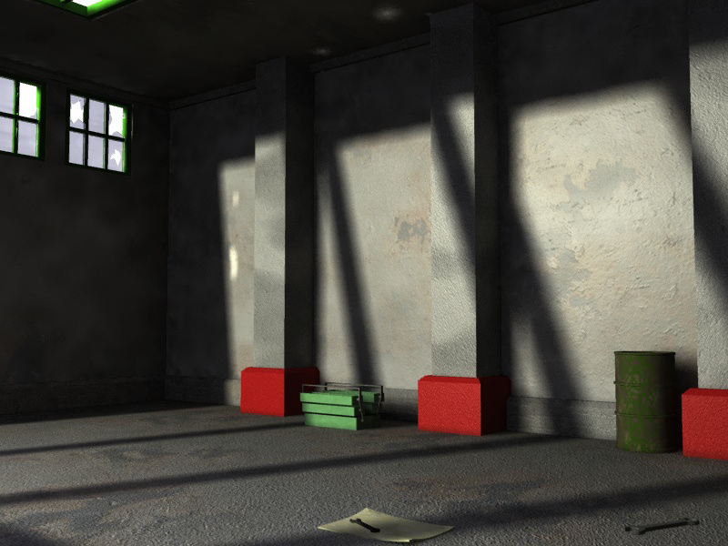 Desde el comienzo, visualicé la gran máquina abandonada en algún tipo de depósito, con apenas una luz brillando. Lo que sigue es un render preliminar de la habitación. Sólo agregué unos pocos objetos a la escena, para dar un sentido de proporción y realismo, pero no demasiado para no desviar la atención del gran móvil a vapor en el centro. La habitación en sí misma es simple, con unas pocas columnas en la pared del fondo, y algunas ventanas: en la pared izquierda, el cielorraso y la pared detrás de cámara. Estos son los emisores de sombras. Como un pequeño detalle, las ventanas están rotas.