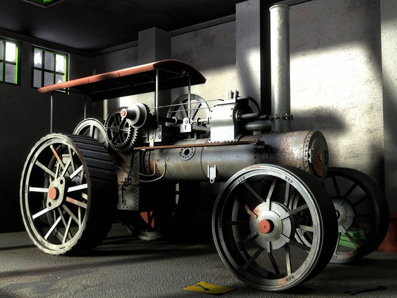 concepto. Todas las buenas imágenes tienen alguna historia detrás de ellas. Obtuve la idea de esta máquina a partir de una existente que vi en un parque histórico local, básicamente, un enorme museo al aire libre. Allí estaba, una enorme bestia de hierro, vieja y oxidada. Pero podrías decir que cuando fue construida, su valor era mucho mayor. Es un móvil a vapor, básicamente un motor a vapor emplazado sobre ruedas, de modo que podrías transportarlo dondequiera que fuera necesario, y hacer funcionar a otras máquinas a partir de él. Apenas lo vi, supe que quería hacer un render 3d a partir de él, así que, obtuve el mejor partido de la situación y tomé dos fotografías, una de ellas exactamente de uno de los laterales. Luego, dos más muy cercanas de la superficie metálica. Éstas, luego se utilizaron como imágenes de referencia y texturas.