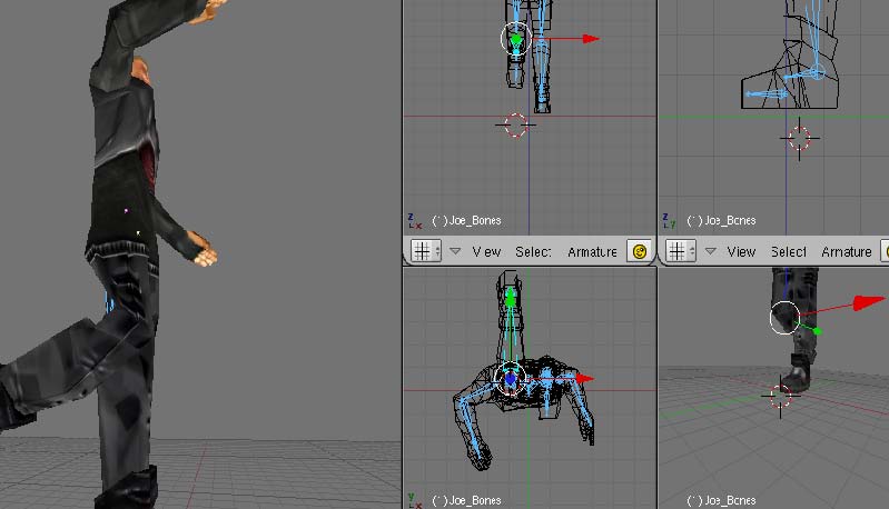 Como siguiente paso asegúrate de que el cursor esté centrado en el área pélvica de joe desde las vistas frontal y lateral. [barra espaciadora] add>>armature. Esto creara una nueva armadura o sistema de huesos para nuestra malla joe. Deberías tener algo muy similar a la imagen siguiente.