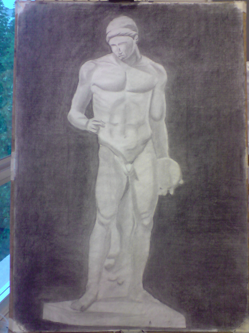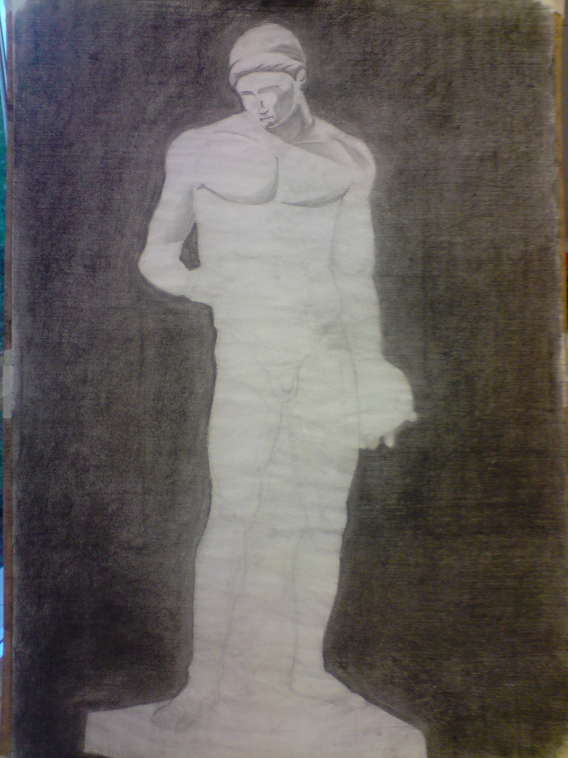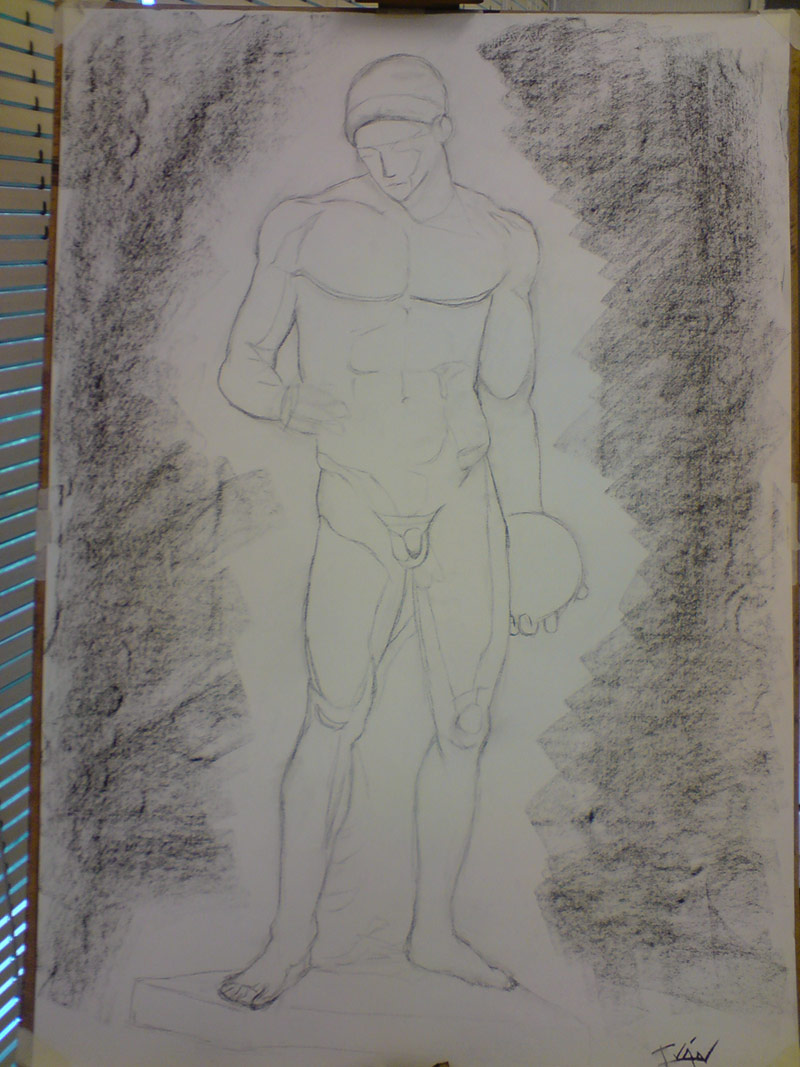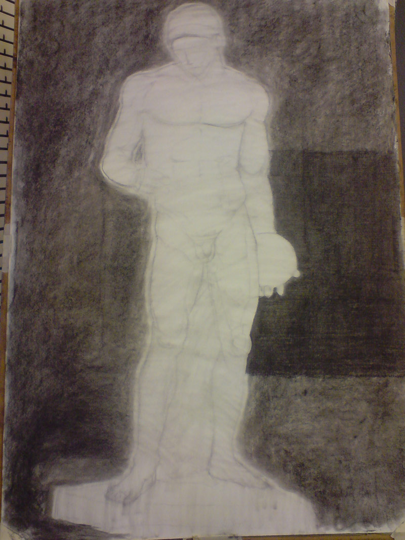 Una vez definido el conjunto en general, sin pasarse mucho, fijaria el carboncillo y a volver empezar a sombrear de nuevo, y así hasta que consideres que el resultado es satisfactorio. Siempre controlando los diferentes puntos de luminosidad (entornar ojos) porque si te pasas es un poco engorroso rectificar.