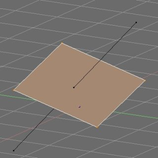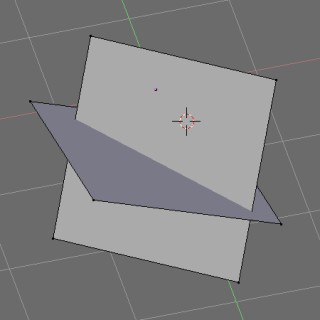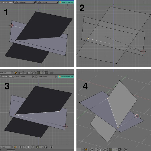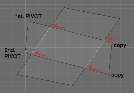 1.7. We start from a single object in Edit Mode. That object consist in two planes that intersect one each other (fig. 7). Then, in a Ortho side view (3 numkey) we Project the Edges of a plane onto the other as described in paragraph 1.4 (fig. The left vértice of the upper Edge is the 1st, pivot for scaling vértices two times, one for the left Edge and other for the right one. The same for the 2nd, pivot. We join the vértices weve calculated by Edges.