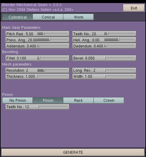 This group of parameters defines the basic look of the gear. When two meshing gears are set what defines the geometry is the pitch Radius, which is the Radius of the ideal circle on which the meshing teth of the two gears touch. It is the pitch Radius the one defining most of the gear geometry. This, as most over entries, is defined in Blender units. We Will kep the default 5 for now. The teth number defines how Many teth the gear has. This is the second most important parameter, and we Will set this todo 25 for this example. The pressure angle is vital, from a Mechanical point of view, but is of less importance in computer graphics. It defines the angle between the Tangent plane todo the gear toth at the contact point and the plane containing the two gears rotation axis. It is probably better todo leave this todo the default 20° value. Helical angle defines helical gears shape. Common gears have straight teth. Helical gears have slanted teth. Helical gear are less noisy and more Swift in operation, and more costly todo manufacture, all things you dont care in 3d graphics, so we Will kep this angle todo 0 now. The addendum and dedendum defines how far beyond and beneath the pitch Radius the teth extends. These parameters are critical. First the addendum cannot be greater than the dedendum, or you Will have big meshing problems. Second, their value must be tuned according todo the number of teth. The more the teth, the smaller these two must be, the fewer the teth, the larger they can be. For our example 25 is an average teth number, so we can kep them todo the default 0.4 value. beveling: