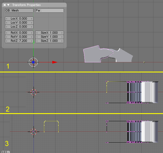 First of all, rotate the main gear toth 1/50 of 360° (7.5°) (fig. 3.1). This makes lower Edge of the toth aligned on the xz plane. In front view and Edit Mode we can extrude the top vertex todo complete the profile (fig. 3.2). Duplicating this and moving it around on the xz plane Will make the profile for the inner gear part todo (fig. 3.3). Now duplicate all these new vértices and mirror them along global z with respect todo cursor.