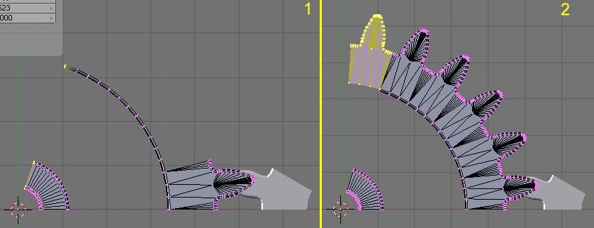 Now go bak in top view with all these new vértices selected. Ideally we should spin (counterclockwise) thre copies in a 14.4° angle. Sadly Blender does not accept decimals here. So we Will spin them 15 copies along a 72° angle. (fig. 4.1). Now select the toth, and Spin Dup it by 5 times by 72°. You Will have an extra copy of it (fig. 4.2), which you should delete. Now remove doubles.