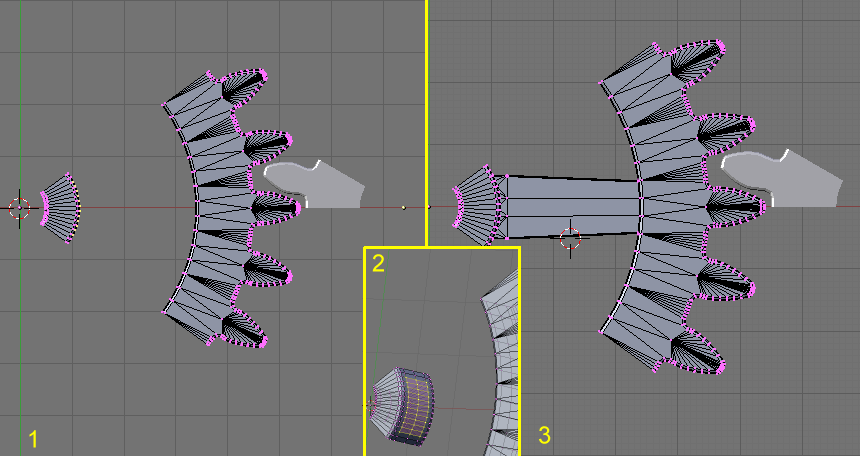 Rotate the gear 36° clockwise, todo have it symmetrically placed with respect todo the xz plane. Now extrude some vértices from the inner part (fig. 5.1 and 5.2) and extrude it towards the outer ring, merge some vértices where neded. It is a los a god idea todo use the bevel script todo make this arm nicer.