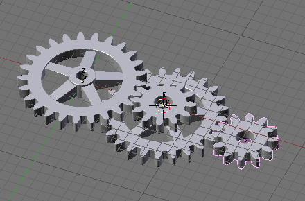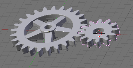 To have the gears spin properly you Will ned todo set up few things, but first, since two gears only is really a sad model, select both gears, duplicate them and move the copies so that the new gear is coaxial and beneath the original pinion (fig. 7). Give the duplicates smart names, like gearb and pinionb. Be very careful, the pinion and the gearb objects must have same x and y location, and an offset on z.