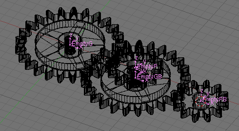 Now add an Empty for each gear, located in the gear center, with the z axis pointing in the direction of the gear rotational axis, then parent gears todo empties. Give them matching names (fig.