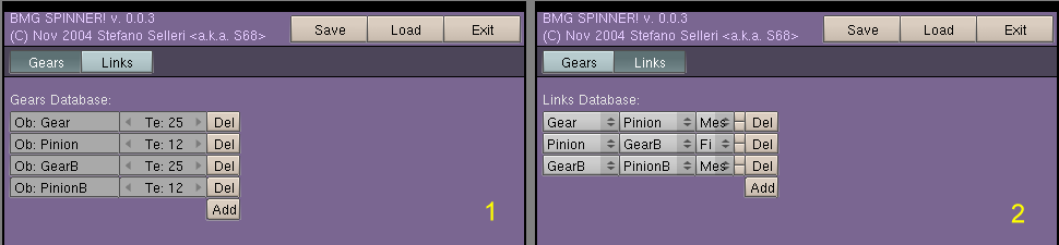Now launch the bmgs script. It is an animation class script. It Will present quite an Empty interfaz, with just an add button. Press it four times and four lines Will appear. In these line first column presents a gear object name. Fill gear in the first and pinion in the second, gearb in the third, pinionb in the fourth. Second column specifies the teth number. gear and gearb have 25, pinion and pinionb have 12. This completes our gears database (fig. 9.1). The gears database Holds información on which objects in your scene is really a gear and should be spinned. You can save and load database to/from disk, the script generates xml files. You are advised todo do so because the databases Will be lost when you kit Blender (the automátically generated script for spinning Will not be lost).