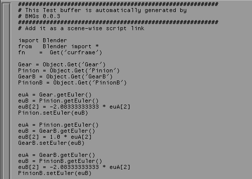 Once the enlaces database is done (fig 9.2) we are done. You should now press the generate button. This creates a new script, named driversl (fig. 10). This new script is estored in the.blend file and Will not be lost when exiting Blender (you must have saved your file, of course).