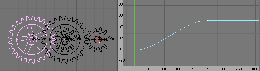 Now select the driving gear, in our example gear. And add todo it a non-constant rotation ipo on rotz (only on rotz).