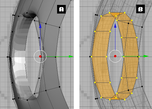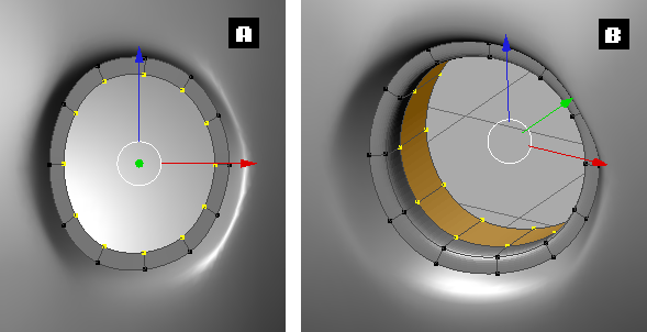 Step 14. Extruding the Faces: get in todo side view by pressing [Numpad 3] and select all the vértices of the eye that form a circle. Press [e] todo extrude the selected vértices and start moving the extrusión in the direction of green axis of the Transformer gizmo as sen in the image 14 (a) and (b).