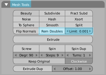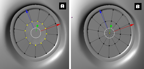 Step 5. Merging the mirrored surfaces: now using the Transformer gizmo of the x axis (red) bring the two meshes closer so that the near Edges are overlapping each other watch the image 23a for the highlighted part, at this point you can zoom in and make sure that those Edges are correctly overlapping each other, now deselect all other vértices and make a box selection [b] around the highlighted part as sen in image 32a, press f9 and go todo the Mesh tools buttons tab (image 24) and make sure the limit value is 0.001 and then click remove doubles button and you should get removed 24 in the popup.