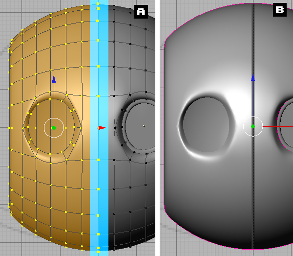 Now get out of the Edit Mode and as son as you get out of the Edit Mode you might se ha black line in the middle of the head Mesh as sen in image 23b. Again get in todo Edit Mode select all vértices and press [Control + N] (calculate normals). Now the Mesh Will look Smooth and you have created the head of the robot.