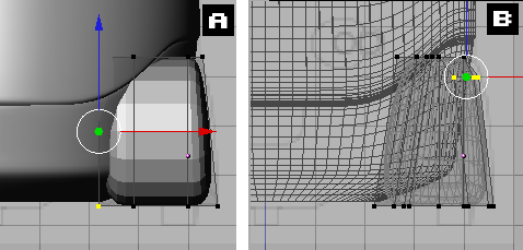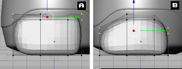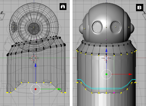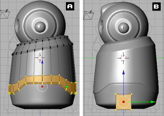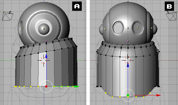 Step 6. Get in todo the side view and scale the lower part of the upper body and upper part of the lower body as shown in image31a. Get out of Edit Mode completely and add a plane [add |Mesh |plane], position it near the side bottom of the robot body, watch image 31b for reference, press [f9] for editing buttons and enable Subsurf button. The Mesh Will turn roundish.
