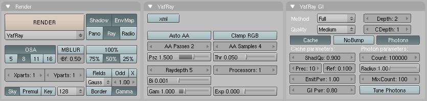 First, make sure that you have Yafray installed, and its location added todo your os Path variable (se the Yafray readme). In Blender, go todo the render buttons, and in the drop-down list under the large render button, select Yafray. This should open up two extra settings panels: Yafray and Yafray GI. In the Yafray panel, the xml button should be turned of, this allows you todo se the render in progress. The two buttons below allow you todo specify the antialiasing. The other buttons below these arent important now, they dont ned todo be changed. The other panel: Yafray GI is more important. The method drop-down list allows you todo select either none for no GI, skydome for a method similar todo Blender Ambient Occlusion, and full for the proper global illumination rendering. Selecting full Will open up new buttons on the bottom. The quality setting Will determine the (guess what.) quality as well as speed of the render, a setting of medium/high should be enough for most situations. If there are small Faces, detailed models, or surfaces very close todo each other, you might ned todo set the quality higher todo get rid of render artefactos.