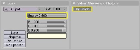 There is only one light in the scene, a Sun Lamp with Raytraced shadows turned on. It is slightly yellowish in colour, with a power of 0.6.