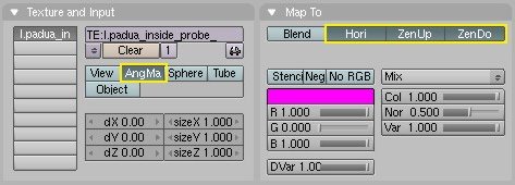 Go todo the texture buttons, and select the green world button. Set texture type todo image, and load the *, HDR file like any other image. Go todo the world button, and in the map todo panel, set mapping todo angular map, and the output todo hori, zenup and zendown. Yafray Will automátically se that you have a HDR world texture, and when GI is turned on, it automátically uses that image for lighting.