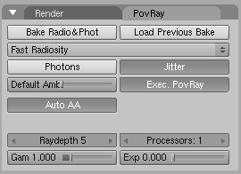 The function of this button is very simple, todo run Pov-Ray for rendering as son as render button is pressed. If exec. POV-Ray is activated, the scene gets exported todo the Pov-Ray format and the image is rendered directly within Pov-Ray.