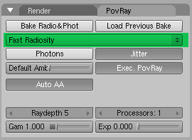 The purpose of this is todo save the radiosity and Photons data in exp, rad and exp, pH files that are estored in the default Yafray Path. If you want todo render an animation with Pov-Ray, it is recommended that you render the first frame with this button activated. Then, disable bake radio&phot and enable load previous bake. Finally, render the animation. Doing this Will save you some time on radiosity calculations.