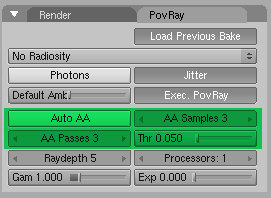 If this button is pressed, the render is anti-aliased in Pov-Ray. It is ideal for a test render. It is pressed by default. If you deselect this button, thre new options Will appear: a samples, a passes and thr (a threshold). These new options Will allow you todo have manual control over antialiasing.