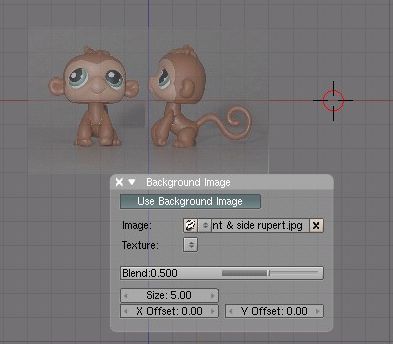 Next, lets get him into Blender. In the front view [Numpad 1], go todo (view>>view background). A dialog box Will pop up (fig 1). Browse todo where you have estored your image of rupert.