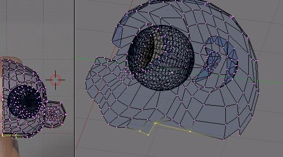 Move the ear further into the ear hole, join the ear todo the head, kep pressed [shift key] the RMB click todo select both objects and then press [j key]. Start merging [alt + m] vértices where they line up. Once we have the ear firmly connected, we Will deleete unneded vértices from inside the head. (fig. 15) seing as how ears are dificult todo explain, por favor look at the included blend file for placement and ear-type tweak of the sphere.